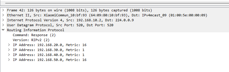 在NetStudio上使用tcpdump工具进行抓包测试,可以看到,当链路断开时,对应子网的Metric字段变为16,表示优先级低。