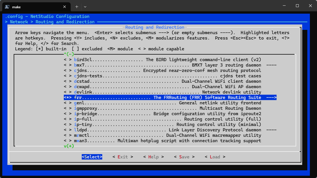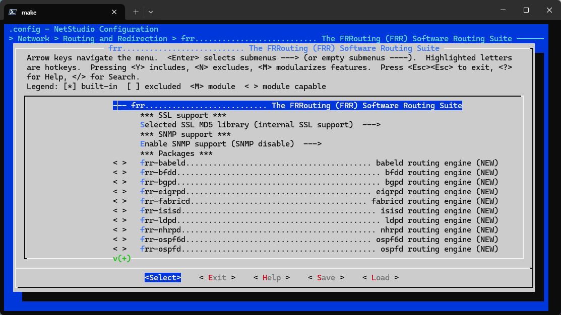 首先,在make menuconfig中勾选frr。frr的路径为Network > Routing and Redirection > frr。勾选frr后,进入frr框则可以看到一些协议,按照所需要的去勾选。